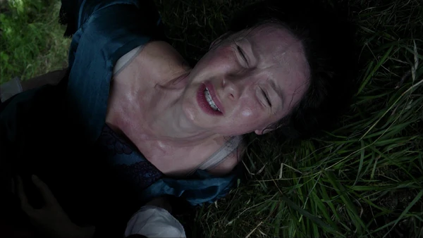 Tras encontrar el lugar del duelo Claire intenta acercarse como puede dada su condición pero no se atreve a intervenir. Allí de pie se agudiza el dolor de su espalda, siente contracciones y se intensifica la hemorragia.