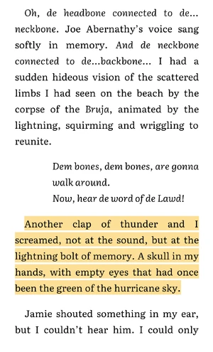 Esta conclusión de Claire ocurre breve y fugazmente en el capítulo final del libro cuando en medio de la tormenta que amenaza con hundir la pinaza del gobernador cae un rayo muy cerca. El resplandor de la luz del rayo hace que Claire vea a Duncan Innes como si fuera un esqueleto y empieza a recordar eventos relacionados con huesos: la canción de Joe Abernathy, los restos de los esclavos que tripulaban el Bruja esparcidos por la playa, etc. En el siguiente rayo Claire grita al recordar aquel cráneo que tuvo en sus manos y ver sus ojos vacíos que antes habían sido de color verde.