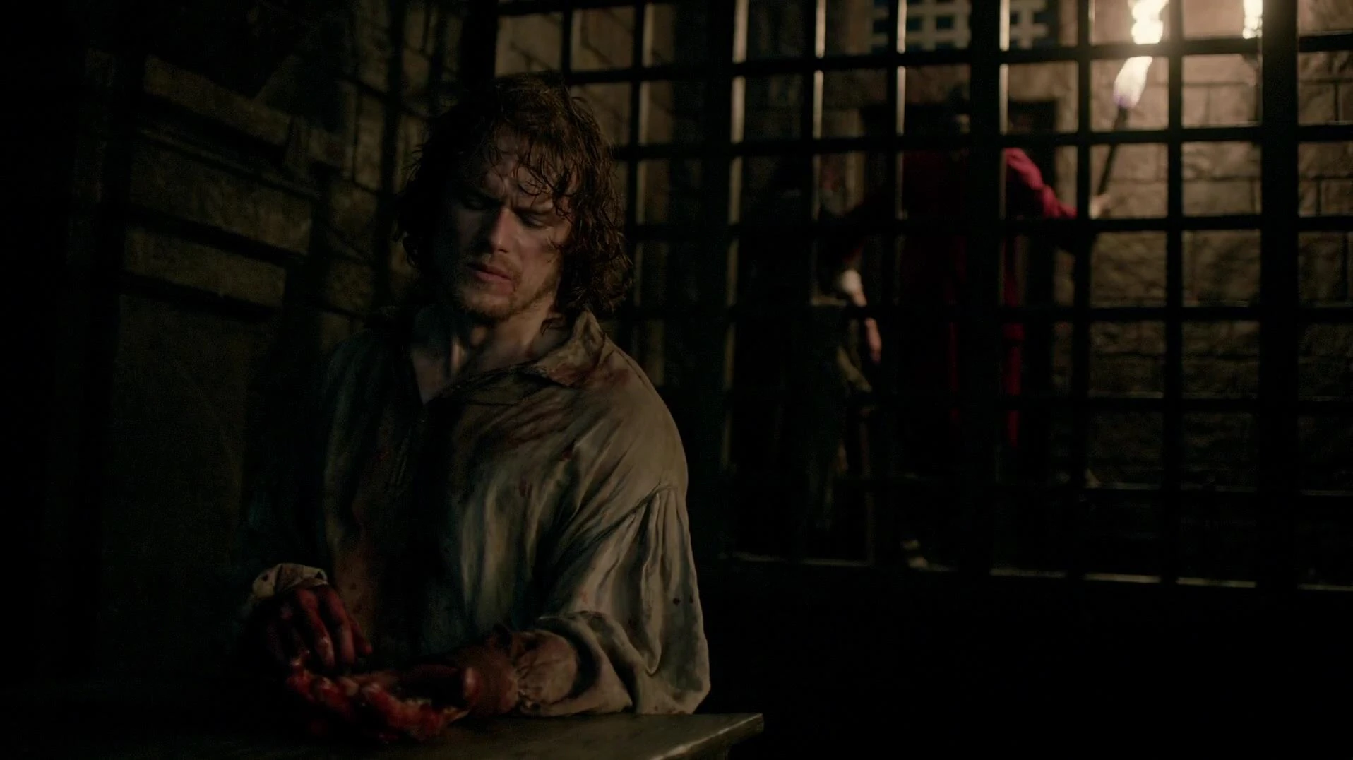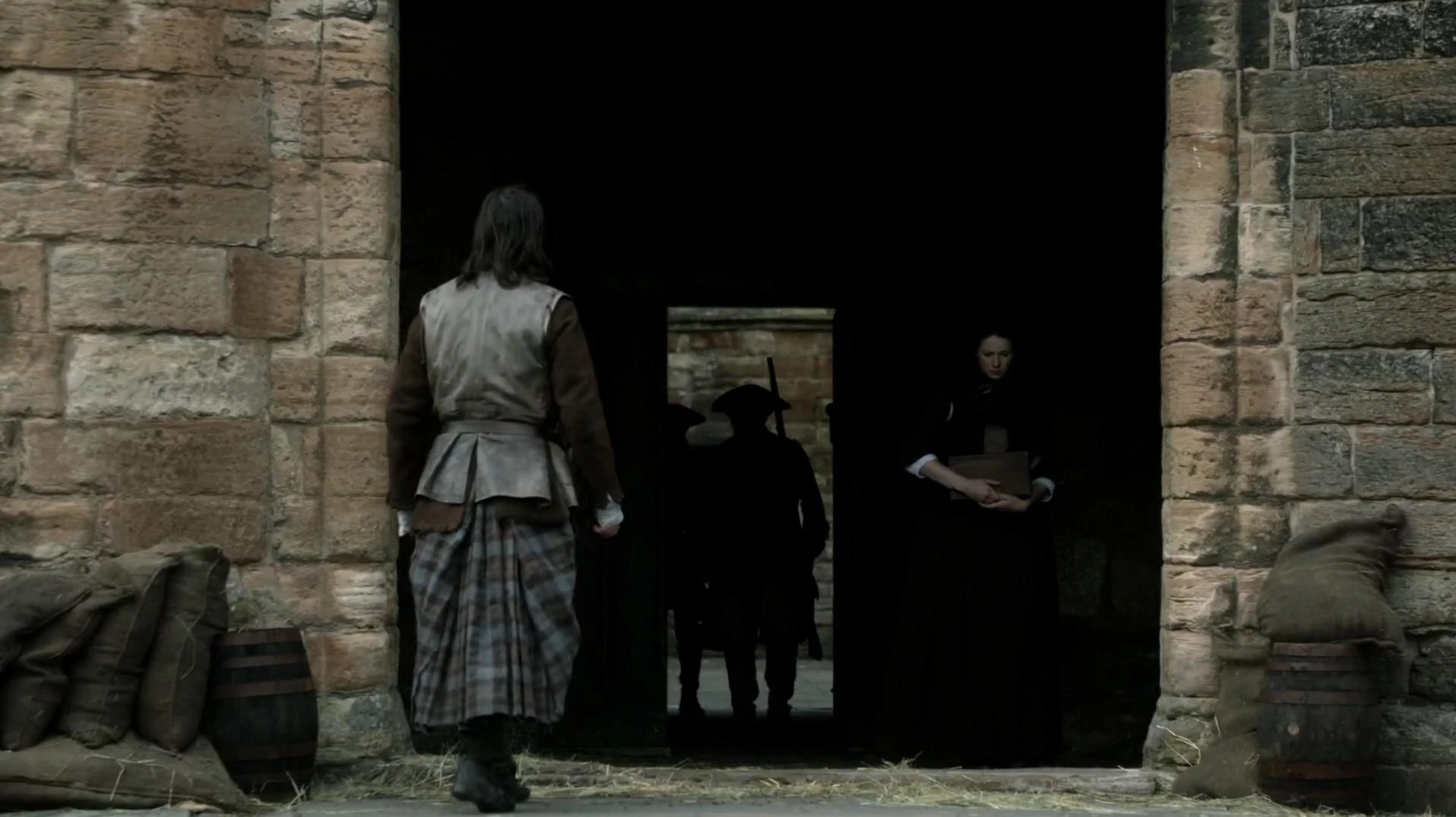En su búsqueda, llega a una zona donde el suelo está pegajoso por la suciedad de años y cubierto por una capa gruesa de polvo pues esta sección de la prisión no se empleaba actualmente. Ahí es donde encuentra a Jamie, en un pequeño calabozo, con una cama, una mesa y dos sillas. En ese momento, Jack Randall descubre a Claire, a la que concede la liberación tirándola por el hueco que da al foso donde echan a los cadáveres de los ahorcados. Jamie ha vivido en Wentworth sus experiencias más duras; ha sido torturado, violado y denigrado como persona por Jack Randall. Finalmente es liberado por Claire, Murtagh y los hombres de Dougal pero recordará la prisión de Wentworth durante mucho tiempo.